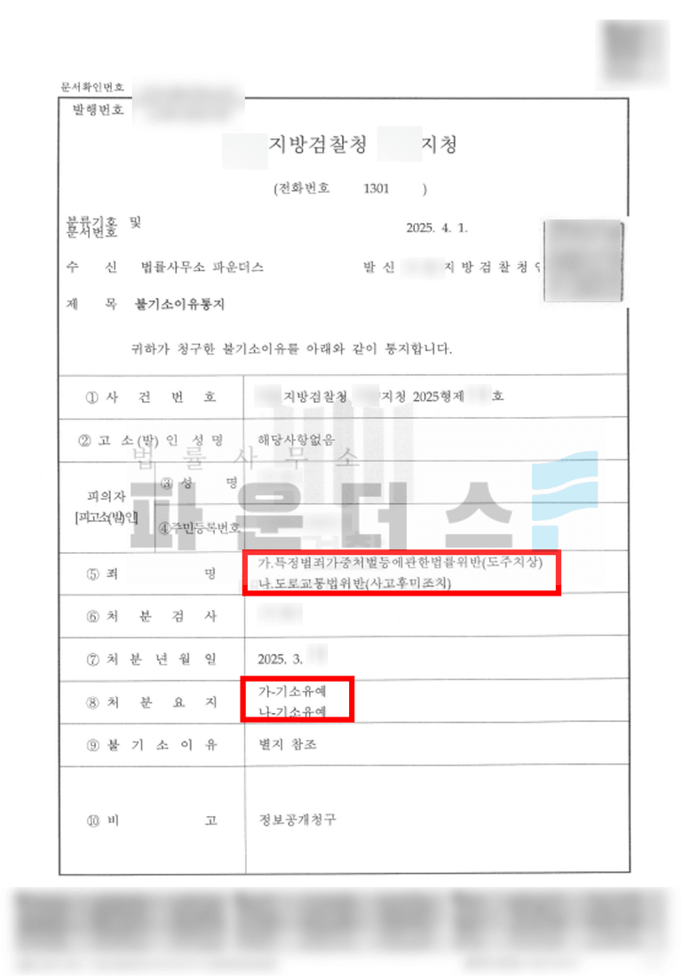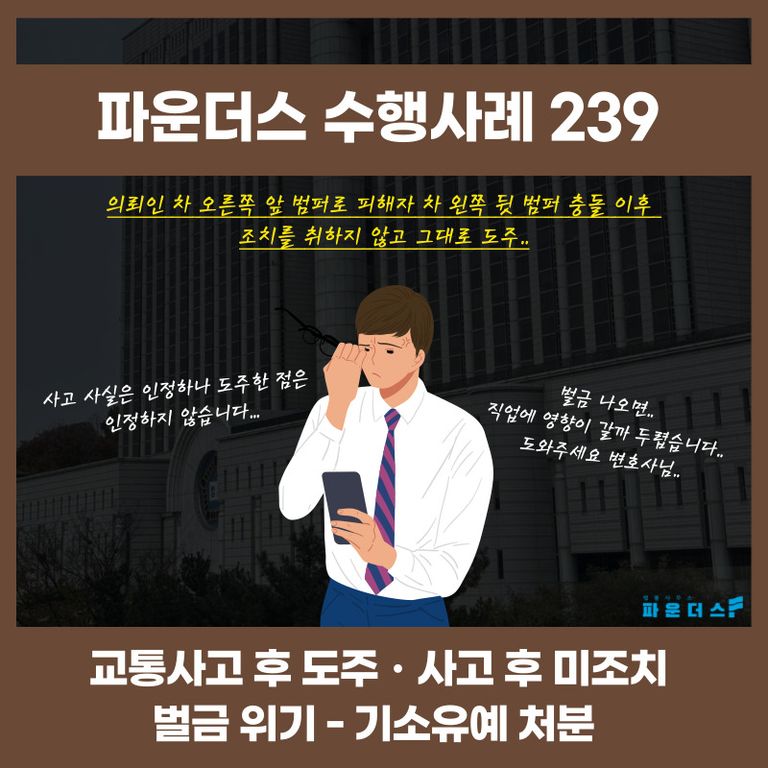 결과적으로 변호인의 주장이 원만히 받아들여져 의뢰인은 도주치상 및 사고후미조치 혐의에 있어 기소유예 처분으로 사건을 마무리 지을 수 있었습니다.