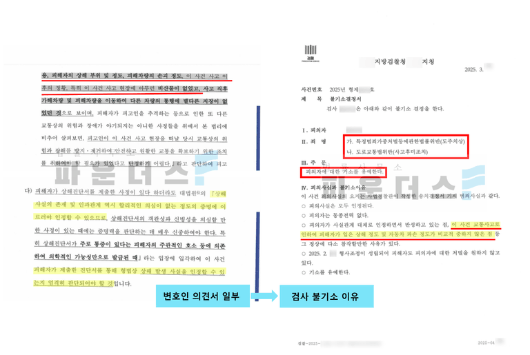 이에 대하여 변호인은 피해자가 입은 상해 정도와 자동차 파손 정도가 중하지 않은 점에 대해 논리적인 주장을 하였고 해당 내용이 원만히 받아들여졌음을 불기소 이유서에서 확인할 수 있었습니다.