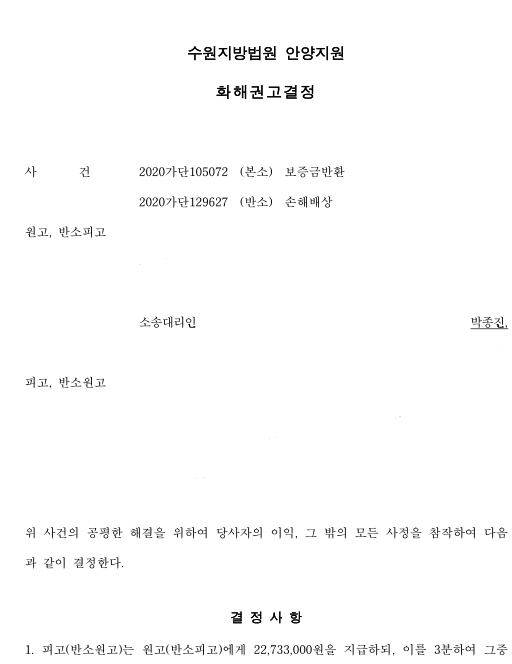 재판부는 마지막 변론기일에 '박종진 변호사의 주장이 이유이 있다는 취지'로 말하였습니다. 이러한 이유로 임대인은 재판부가 보낸 화해권고결정을 받아들였습니다.