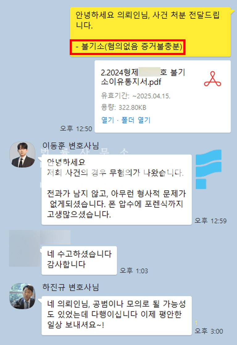 나아가 포렌식 절차에 변호인이 함께 참여하여 사건과 관련 없는 내용이 증거로 수집되지 않도록 조력하였고, 이 과정에서 이 사건과 별개의 여죄가 발견되지 않도록 도움을 드렸습니다.
