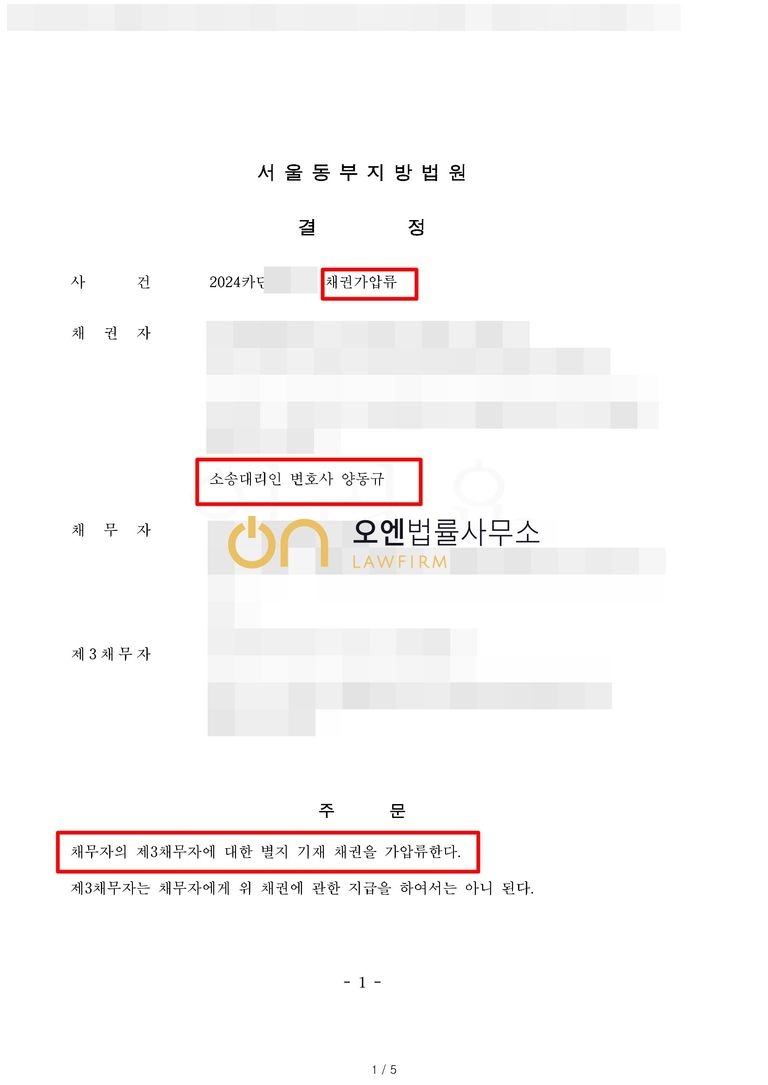 재판부는 담당변호사의 주장을 받아들여 채권 가압류 결정을 하였습니다.