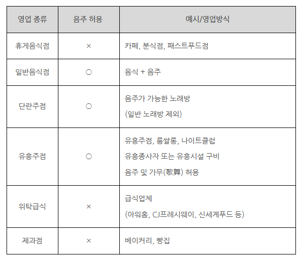우리의 일상생활에서 ‘먹고 마시는 일’은 너무나 중요한데, 이와 관련되는 영업, 즉 카페, 음식점, 주점 등은 모두 식품위생법에서 규정하고 있습니다. 일정한 시설을 갖추고 음식물이나 음료 등을 손님에게 직접 제공하는 영업을 식품접객업이라 합니다. 휴게음식점과 일반음식점은 해당 업소에서 음주가 허용되는지에 따라 구별됩니다. 카페, 분식점은 휴게음식점이고, 주류 냉장고가 보이는 음식점은 일반음식점입니다. 식품위생법에서 영업의 종류를 세부적으로 구분하는 이유는 그에 따른 시설기준이나 영업자 준수사항을 달리 정하고 있기 때문입니다. 식품접객업 영업을 위한 인허가에 있어서도 단란주점영업과 유흥주점영업은 허가를 필요로 하지만 나머지 영업은 신고만 해도 되는 것으로 하고 있습니다. 허가나 신고는 기초자치단체장인 시장ㆍ군수ㆍ구청장에게 하여야 합니다. 허가영업이 인허가를 받기에 더 까다로운 것은 물론입니다.