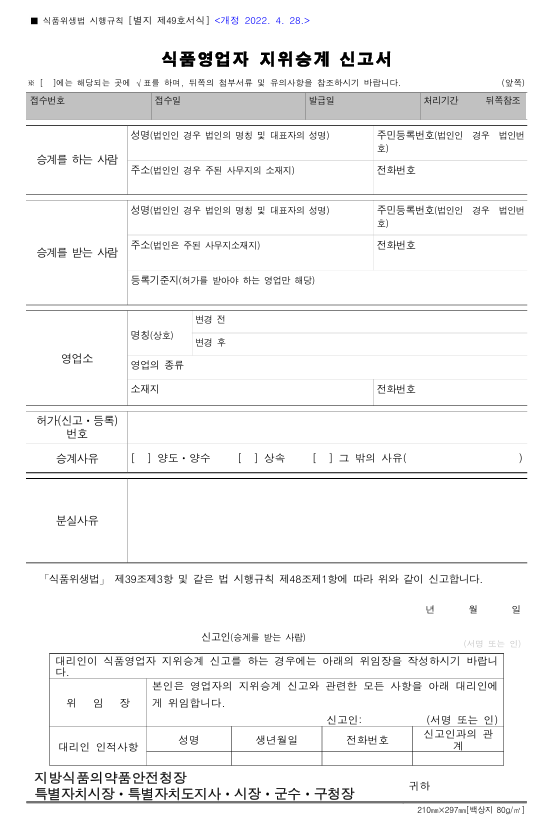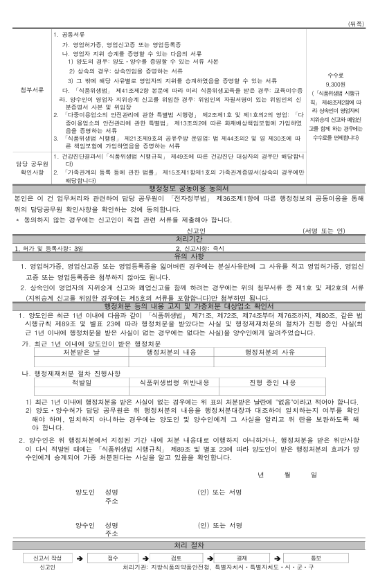 앞서 일반음식점영업은 신고영업이고 유흥주점은 허가영업이라고 하였습니다. 그러면 영업양도가 있는 경우 영업양수인은 해당 지자체에 새로 신고를 하거나 허가를 받아야 하는지 문제됩니다. 그런데 식품위생법에서는 양도인이 해당 영업을 신고하거나 허가를 받아 적법하게 영업을 할 수 있는 공법적 지위는 양수인에게 이전되는 것으로 규정함으로써 양수인이 새로 신고를 하거나 허가를 받을 필요 없이 영업양도로 영업자의 지위가 승계되도록 하고 있습니다. 다만, 양수인이 영업자지위 승계의 신고를 하여야 합니다.