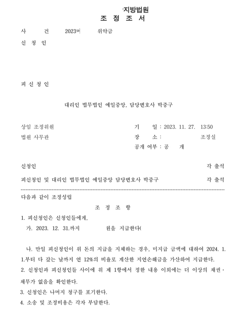 의뢰인께서 부동산 매매계약상 위약금 청구를 당한 건으로, 의뢰인의 억울한 사정을 듣고 주장을 정리하여 상대측 청구금액 중 일부만 지급하는 조건으로 원만한 합의를 이끌어내고 본안소송으로 가기 전에 합의로 원만히 종결시킨 건입니다.