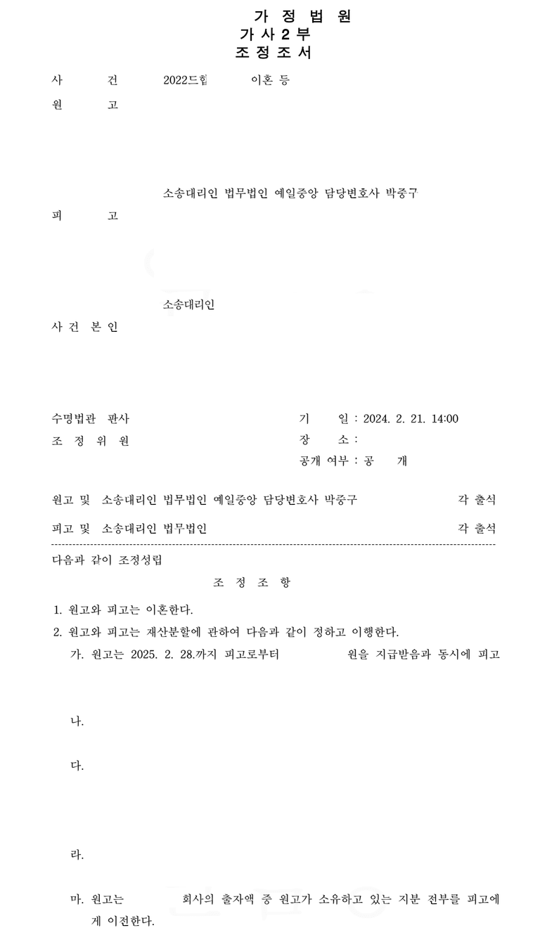 의뢰인은 배우자와의 재판상 이혼을 의뢰하셨고, 재산분할을 위해 배우자 소유 재산을 조회하고, 비상장주식회사 주식 등을 포함하여 재산분할청구를 정리하는 한편, 친권 및 양육권까지 취득하는 것으로 원만히 합의로 종결한 사례입니다.