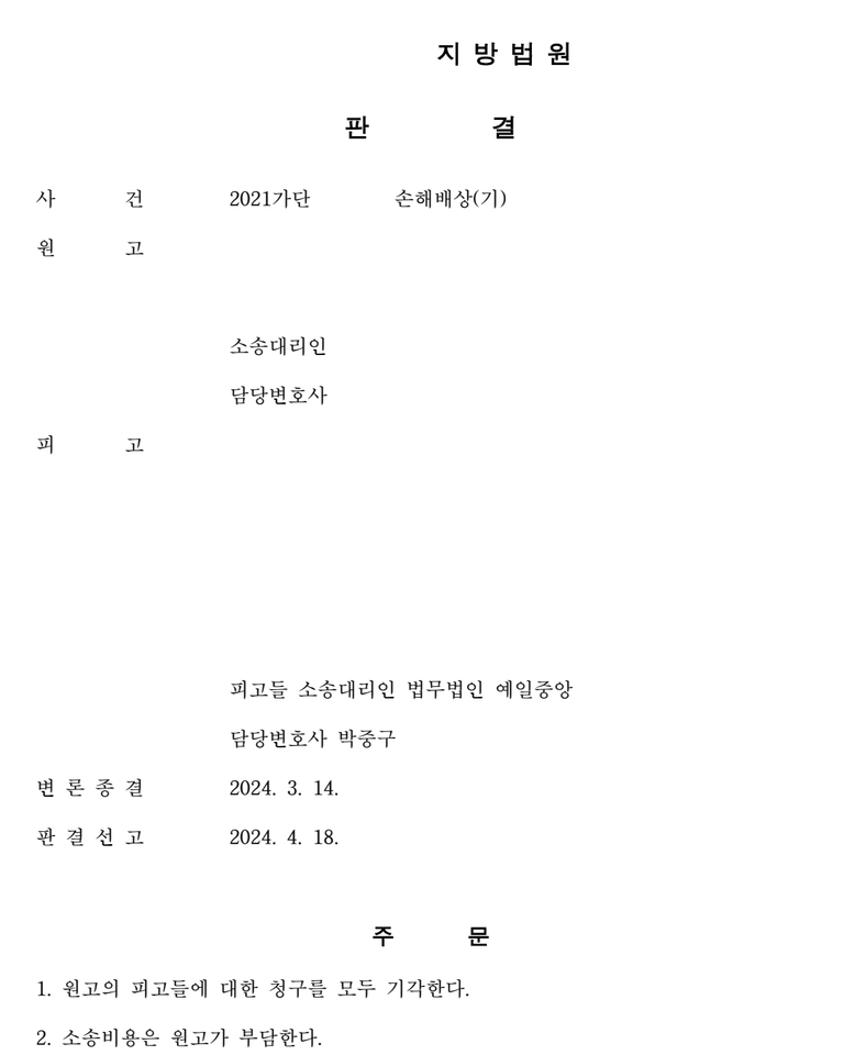 상대방은 자신의 전적인 과실로 발생한 손해임에도 의뢰인에게도 과실이 있다는 이유를 들어 손해배상청구를 한 사안에서, 상대방 주장들의 맹점과 신뢰할 수 없는 이유를 분석 주장하여 상대방 청구의 기각판결을 받아낸 사례입니다.