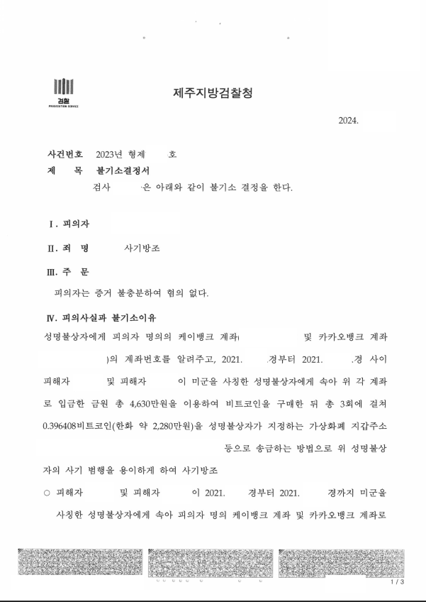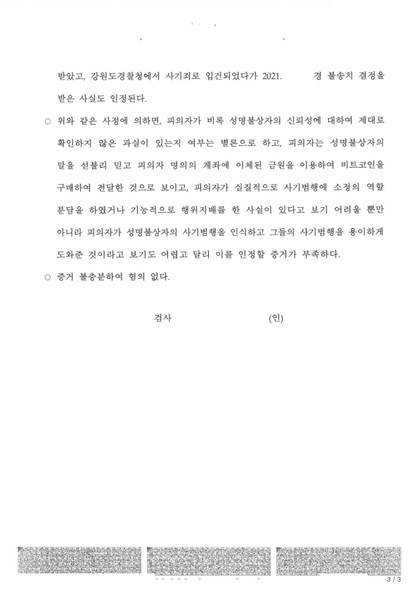 의뢰인은 대출을 알아보다가 성명불상자의 지시로 그에게 자신 명의 케이뱅크 및 카카오뱅크 계좌번호를 알려주고 피해자들이 위 계좌로 돈을 입금하자 성명불상자의 지시로 그 돈으로 비트코인을 구매한 후 그의 지시로 가상화폐 지갑주소 등으로 송금하여 사기방조로 입건되어 저를 찾아오셨습니다. 경찰은 기소의견으로 검찰에 송치하여 매우 위험한 상황이었습니다.