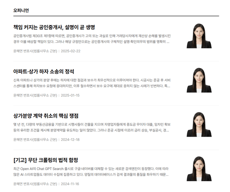 최근 연재에서는 공인중개사 책임 범위와 손해배상 문제, 아파트 및 상가 하자 소송의 쟁점, 상가 분양 계약 해지의 핵심 쟁점, AI 크롤링과 데이터법의 한계 등 다양한 주제를 흥미롭고 깊이 있게 풀어내며 법률 콘텐츠의 ‘새로운 기준’을 제시하고 있습니다.