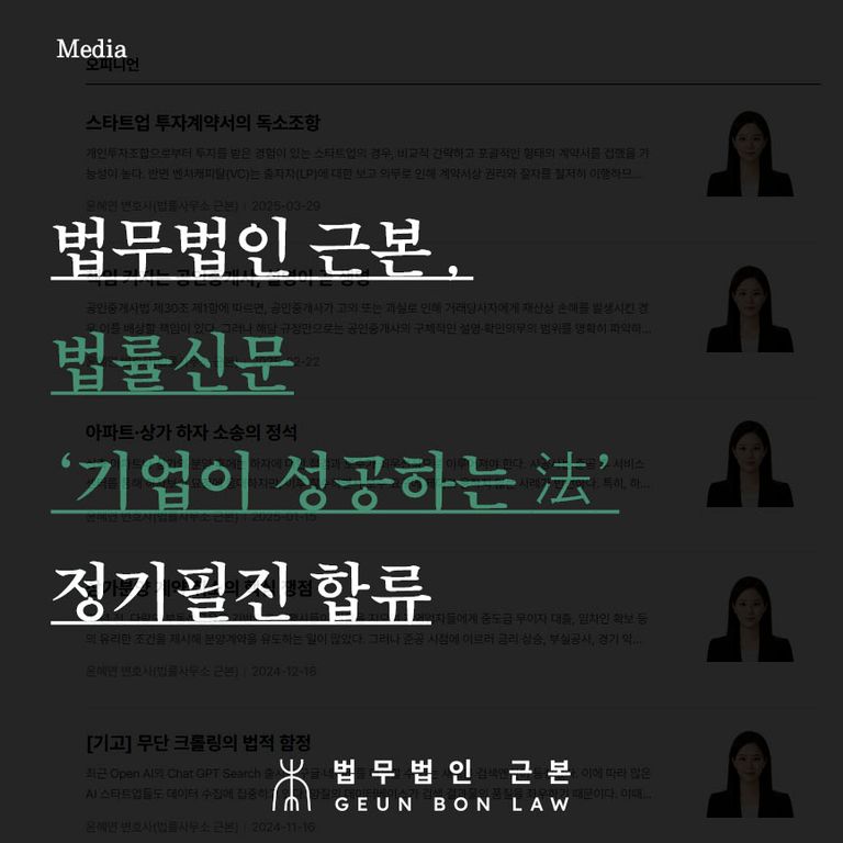 법무법인 근본의 윤혜연 변호사는 2024년 11월 16일자로 법률신문에 ‘기업이 성공하는 법’이라는 주제로 정기 연재를 시작하였습니다.