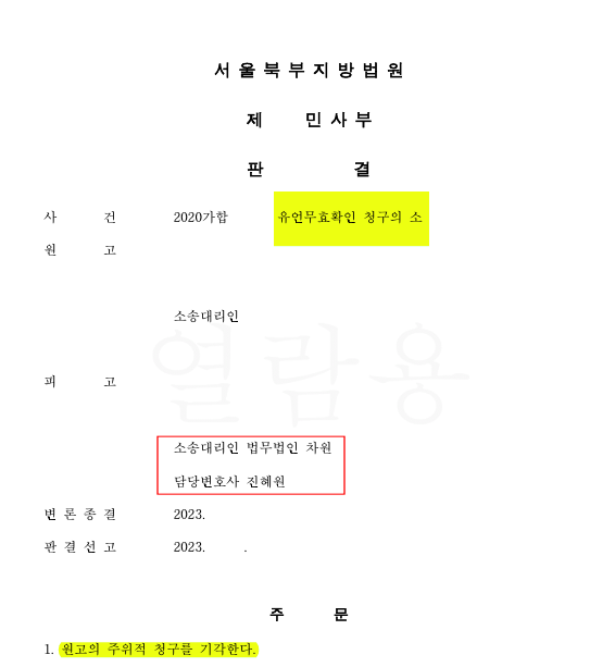 진혜원 변호사는 유언무효확인청구의 소를 제기 당한 피고를 대리하여 판례 법리 및 각종 사실관계를 꼼꼼히 주장함으로써 '원고의 청구를 기각한다'는 피고 승소 판결을 이끌어냈습니다.