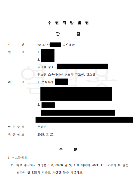 원고(의뢰인)은 건축업자로서 피고회사와 공사계약을 체결하였고, 실질적 대표와도 공사계약을 체결하고, 약속된 공사대금 1억원 전액을 지급하였습니다. 그러나 피고들은 실제로 어떠한 공사도 이행하지 않았고, 연락도 두절된 상태였습니다. 원고들은 계약의 이행을 여러 차례 요청했으나 피고들은 이를 회피하거나 무시하였고, 이에 결국 법률사무소 무율을 통해 민사소송을 제기하게 되었습니다.