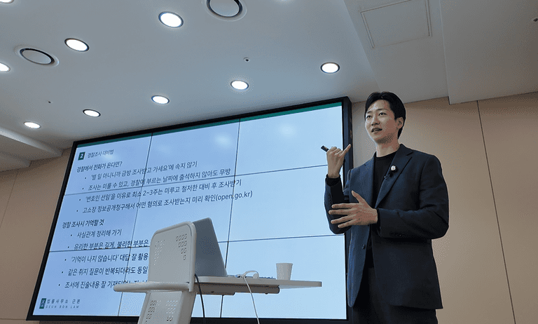 강연의 두 번째 주제는 형사 사건에 대비하는 방법이었습니다. 경찰로부터 조사를 요청받았을 때의 대응 방법과, 사전에 어떤 준비가 필요한지를 중심으로 강의가 진행되었습니다.