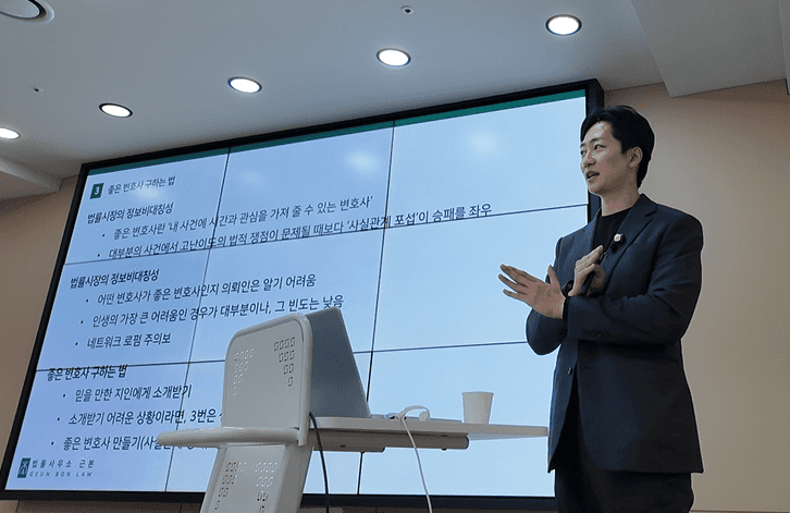 강연 마지막에는 좋은 변호사를 선택하는 방법에 대한 조언도 함께 이루어졌습니다. 법률시장의 정보 비대칭성으로 인해 변호사의 역량이나 사건 처리 방식에 대해 의뢰인이 미리 판단하기 어렵기 때문에, 실제 상담을 통해 비교하고 신뢰할 수 있는 전문가를 찾는 과정이 중요하다는 설명이 이어졌습니다.