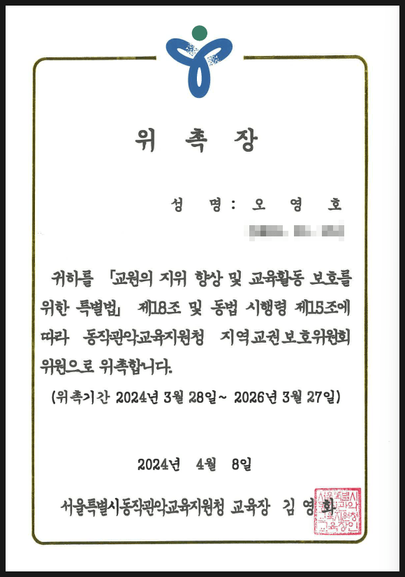 법무법인 근본의 오영호 변호사는 2024년 3월 28일부터 2026년 3월 27일까지 「교원의 지위 향상 및 교육활동 보호를 위한 특별법」 제18조 및 동법 시행령 제15조에 따라 2년간 동작관악 교육지원청 지역교권보호위원회 위원으로 위촉되어 활동하게 되었습니다.