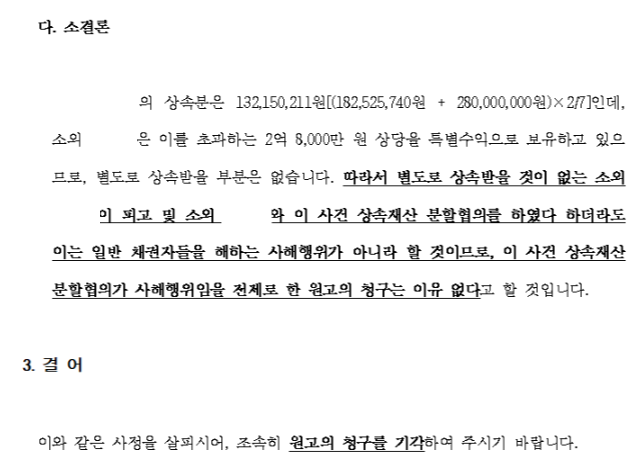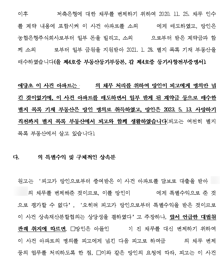오히려 이를 피고에 대한 특별수익으로 보아야 한다는