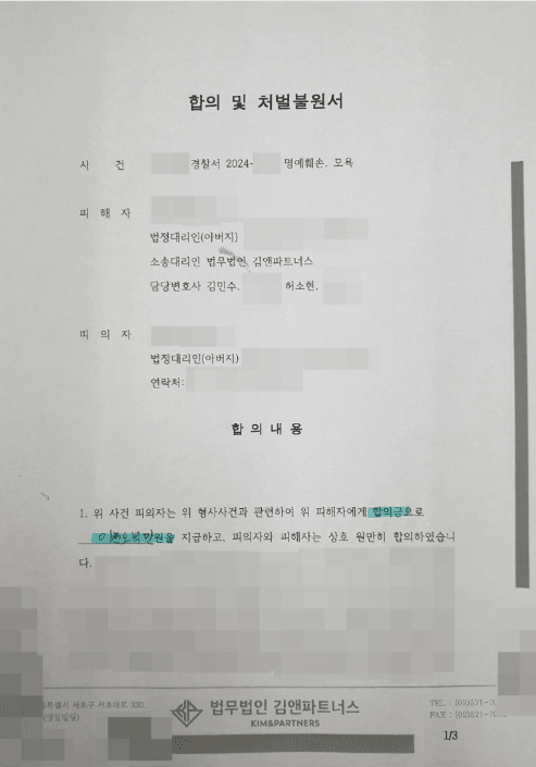 다행히 A양의 부모님은 초기부터 법적 조력을 받아 체계적으로 대응하셨고, 그 결과 실질적인 보상을 받는 동시에 B군에게 재발 방지를 약속받을 수 있었습니다.