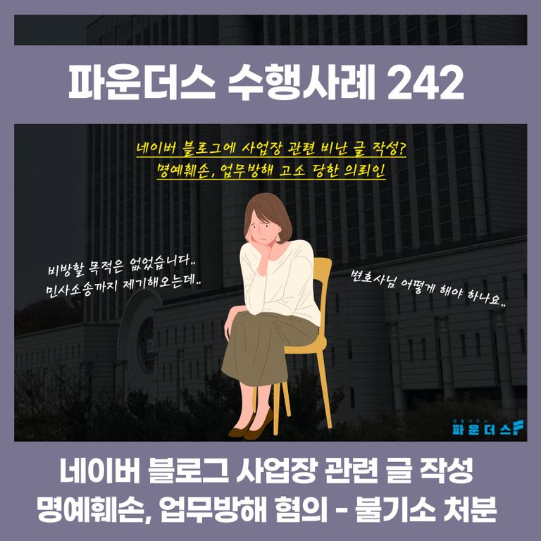 의뢰인은 가족과 함께 방문한 한 사업장에서 자신의 어머니를 향한 불친절한 대응태도에 항의를 하고자 네이버 블로그 댓글에 관련 내용을 작성하였고 이에 명예훼손 및 업무방해로 고소를 당하였습니다.