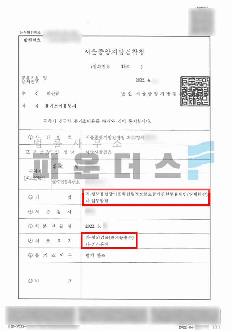 긴 시간에 걸친 싸움이었지만 끝까지 법리적 검토와 논리적 주장으로 무혐의 주장에 힘쓴 것으로 명예훼손 혐의와 업무방해 혐의 모두 불기소 처분의 결과를 받을 수 있었습니다.