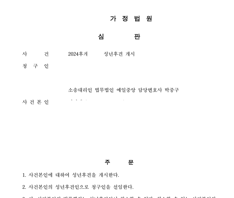 사건본인이 뇌사 상태로 장기화되자 연명치료를 위해 사건본인의 재산처분이 불가피했던 건에서, 법원으로부터 성년후견개시결정을 받은 사례입니다.