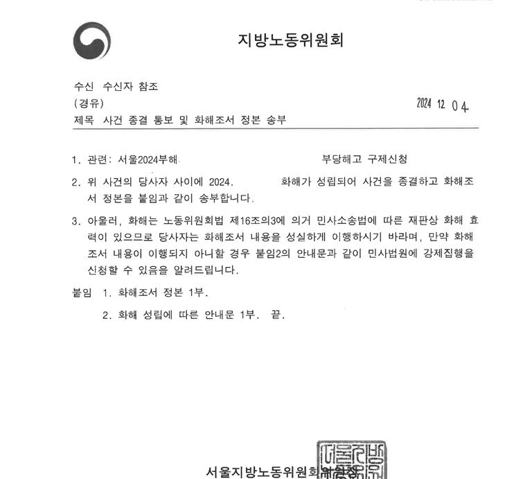 의뢰인이 사측의 일방적인 부당해고를 당하여 의뢰하신 건으로, 지방노동위원회에 부당해고 구제신청을 하고 의뢰인의 억울한 이유를 소명하여 결국 사측과 화해로 원만히 해결한 사례입니다.