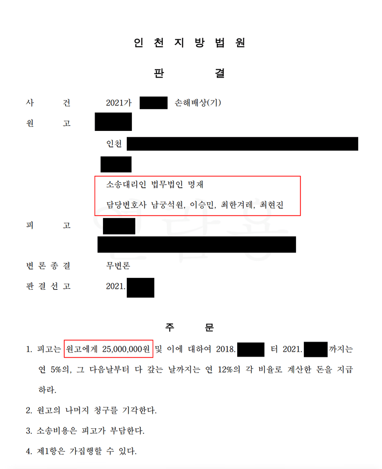 상간남은 의뢰인에게 위자료 2,500만 원과 지연손해금, 소송비용까지 모두 부담하라고 나왔습니다.