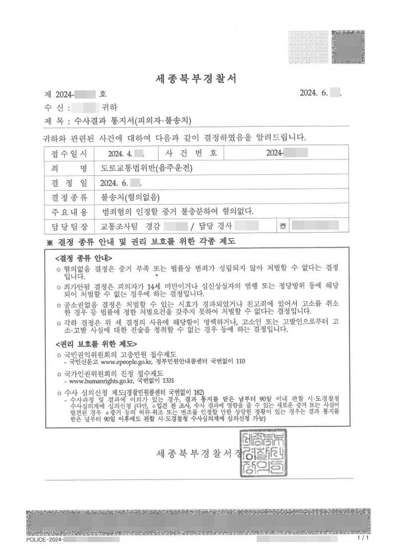 이를 담당수사관이 검토한 결과 불송치(혐의없음) 처분이 이루어졌습니다.