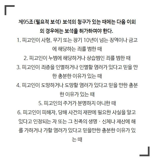 형사소송법에 6가지 사유가 없으면 보석을 허가라하고 규정되어 있느니, 저도 당연히 보석이 허가되겠지요?
