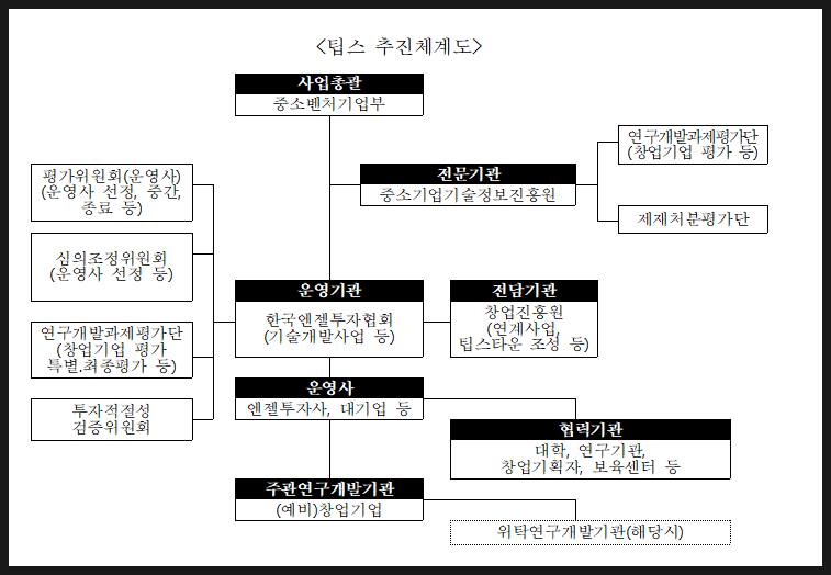 (3) TIPS 프로그램을 총괄하는 정부 부처는 "중소벤처기업부"인데, 세부적인 실무를 위탁받아 수행하는 기관은 "운영기관"인바, 현재 "한국엔젤투자협회"가 이를 맡고 있다.