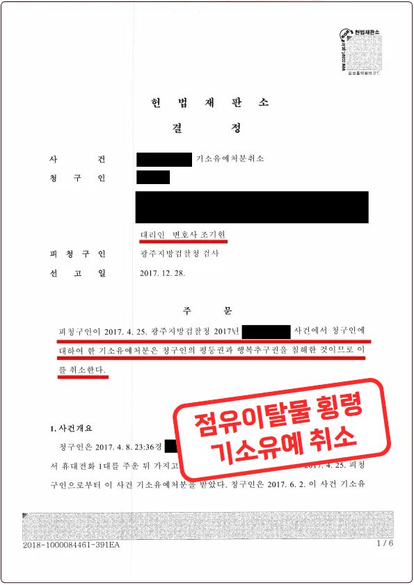 이 사건 의뢰인은 주점 입구 2층 계단에서 타인이 분실한 휴대폰을 주운 뒤 가지고 가 점유이탈물을 횡령하였다는 혐의로 검사로부터 기소유예 처분을 받았습니다. 의뢰인은 휴대폰에 대한 불법영득의사가 없었으므로 이는 검사의 자의적인 기소유예 처분이므로 이를 취소하는 헌법소원심판 청구를 조기현 변호사에게 의뢰하였습니다.