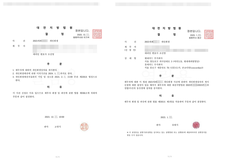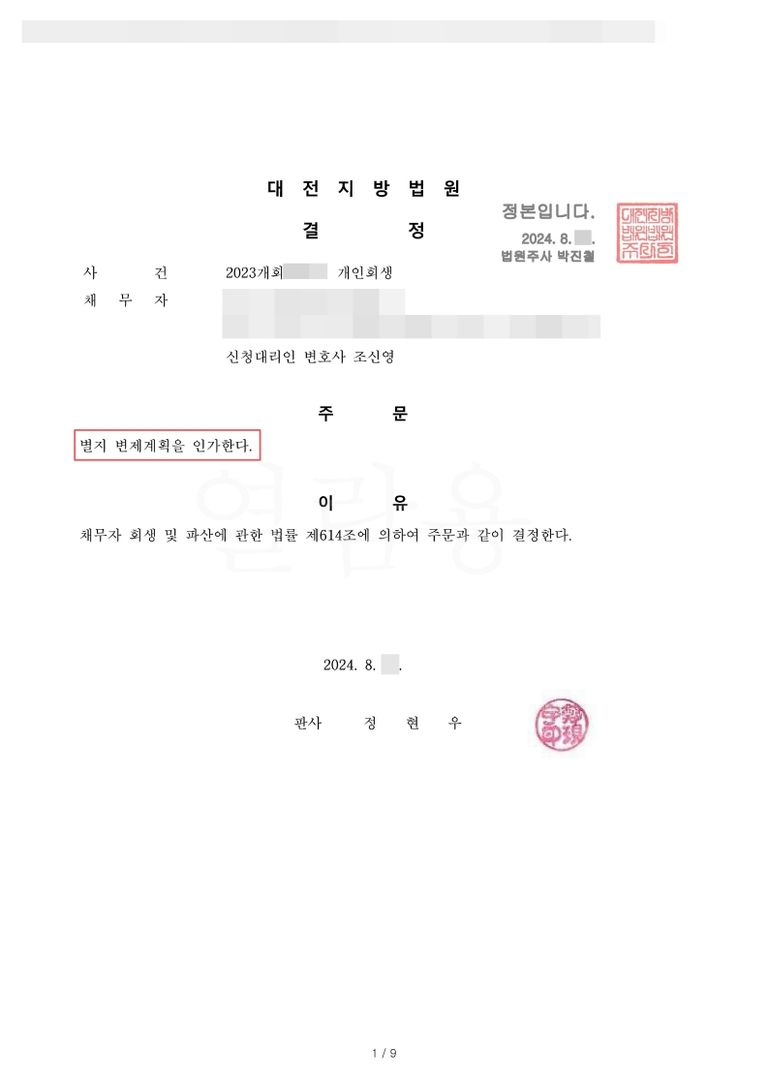 해당 사건은 지위변경에 동산경매신청까지 여러모로 힘든 부분이 많았지만, 잘 해결이 되어 보람을 많이 느꼈습니다. 개인회생을 고민하고 계시다면 언제든지 문의주세요.