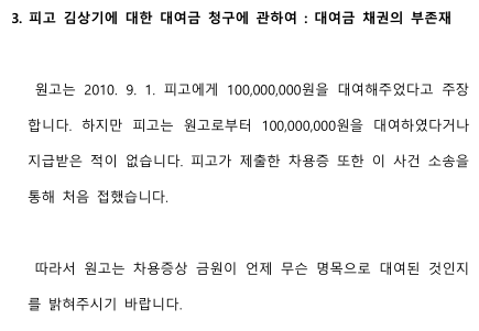 박종진 변호사는 일단 원고가 대여금이라고 주장하는 1억 원이 지급된 적이 없다는 사실에 무게를 두고, '차용증의 작성 경위를 원고가 자인'하게 하기 위하여 차용증 자체를 본 적이 없다고 주장했습니다(부지).