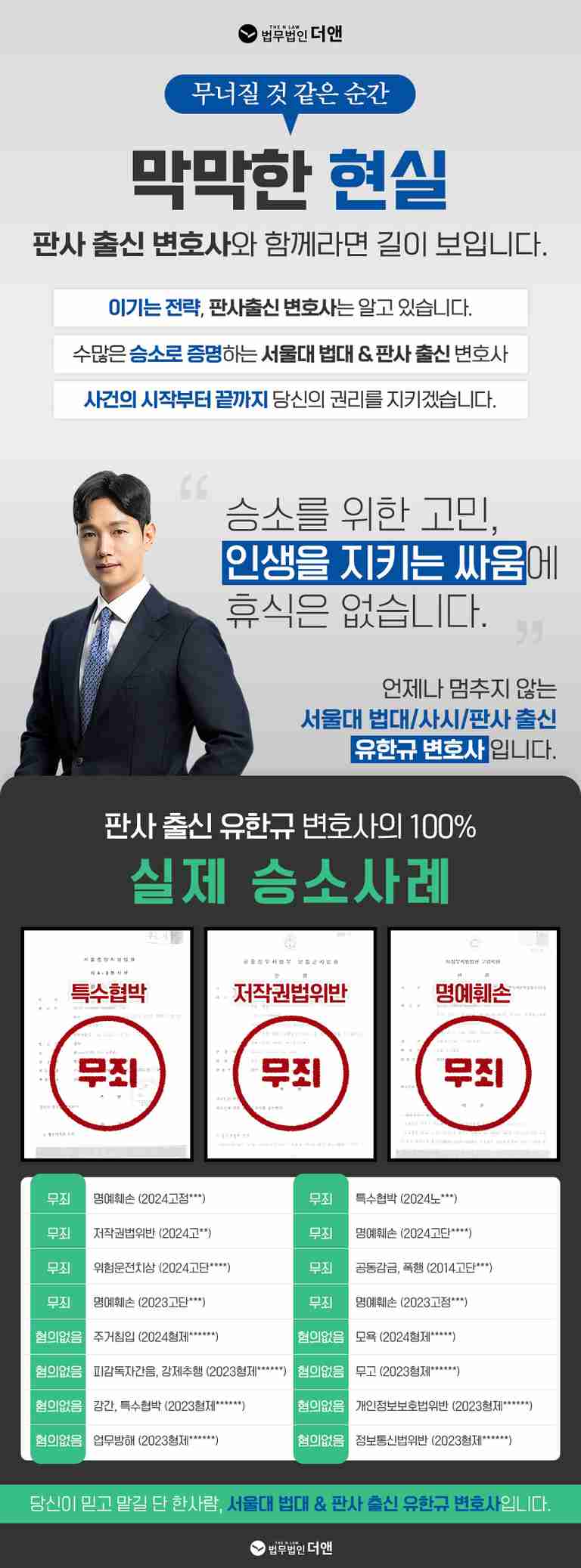 A씨와 같이 억울하게 일생일대의 위기에 처하신 분들은 주저하지 마시고 저희 법무법인 더앤에 연락주세요. 비교할 수 없는 전문성을 바탕으로 저희가 꼭 위기에서 구출해 드리겠습니다. 감사합니다.