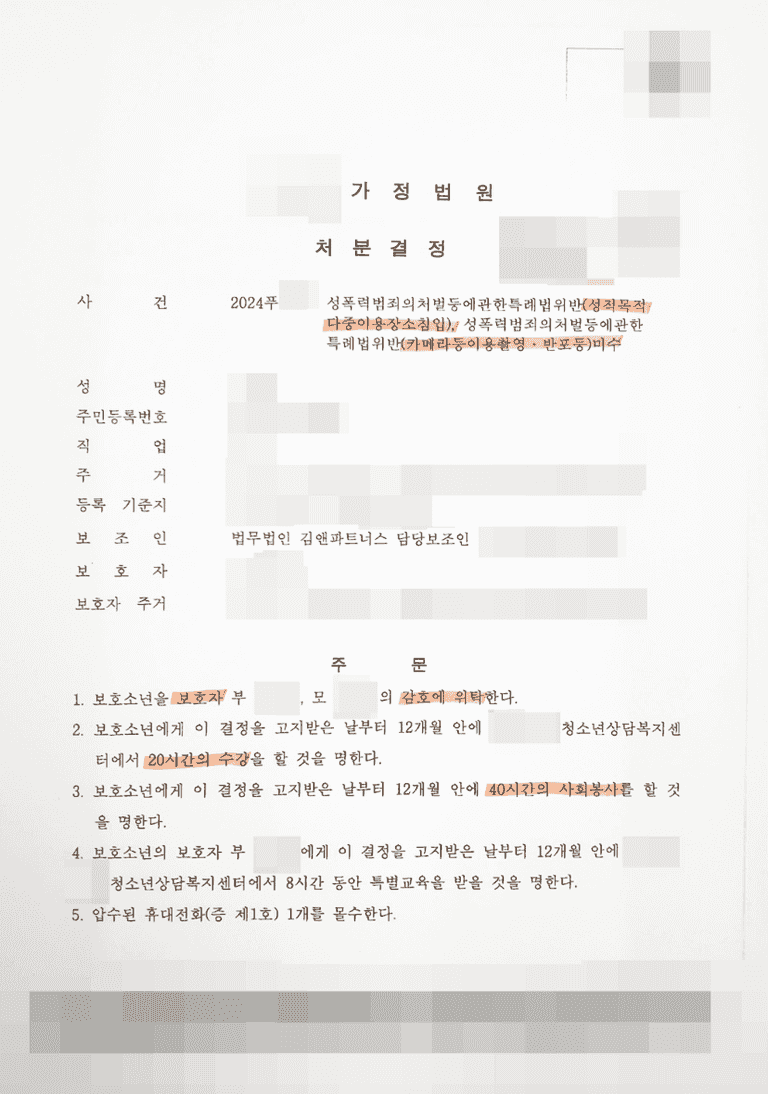 특히 촬영 여부와 상관없이, 다중이용시설에 무단 침입한 사실 자체만으로도 성폭법 위반으로 보호처분이 내려질 수 있습니다.