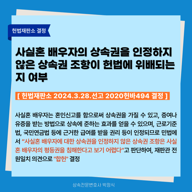 나아가 위 결정에서 법률혼주의를 채택한 취지에 비추어 볼 때 제3자에게 영향을 미쳐 명확성과 획일성이 요청되는 상속과 같은 법률관계에서는 사실혼을 법률혼과 동일하게 취급할 수 없으므로, 위 상속권 조항이 사실혼 배우자의 평등권을 침해한다고 보기 어렵다”고 판단하여, 재판관 전원일치 의견으로 "합헌 결정"(2020헌바494)을 내린 것입니다.