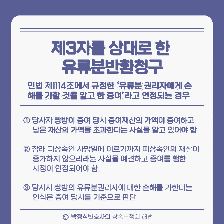 즉, 피상속인이 생전에 자신의 재산을 상속인이 아닌 제3자에게 증여한 경우에도 유류분권리자인 상속인들이 피상속인으로부터 재산을 증여받은 제3자를 상대로 유류분반환청구를 할 수 있습니다.