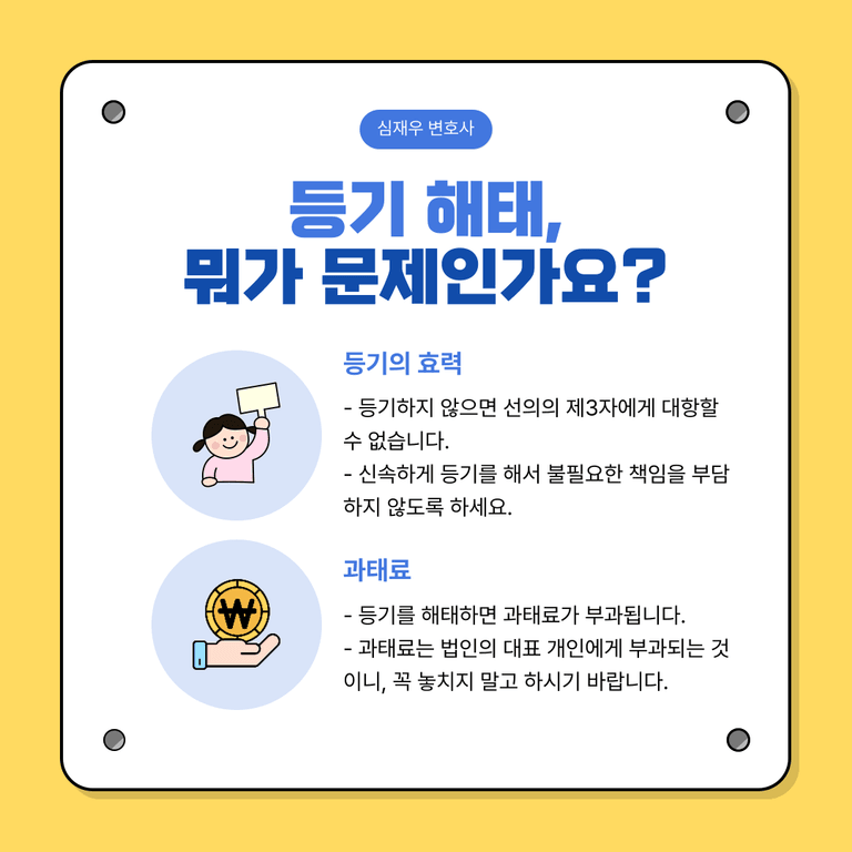따라서, 등기할 사유가 발생하면 서둘러 등기를 하는 것이 바람직합니다.