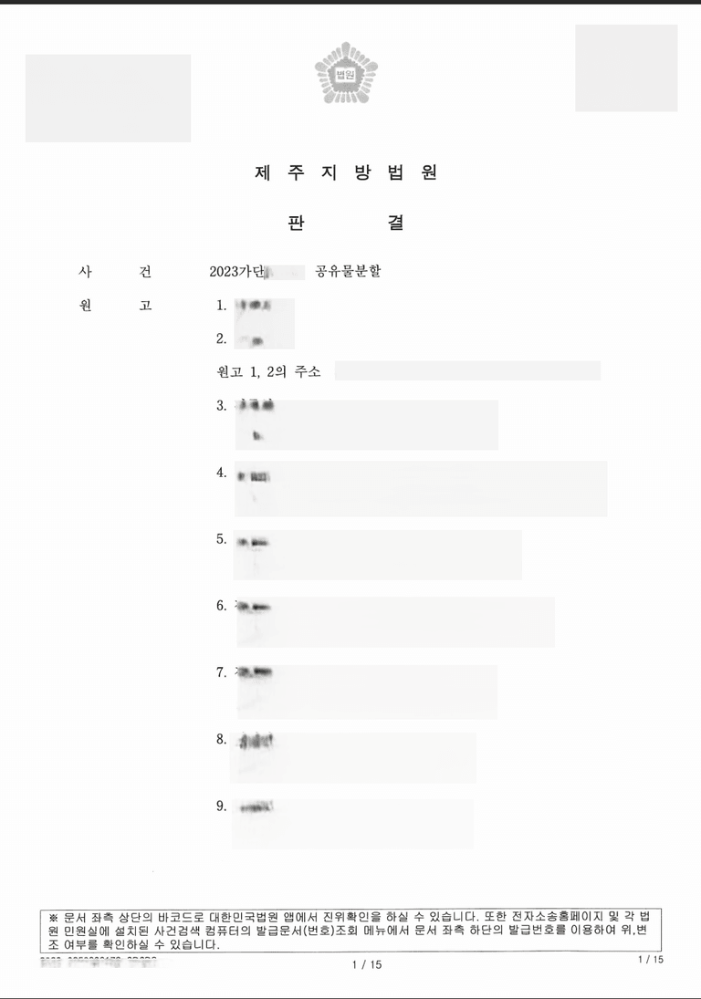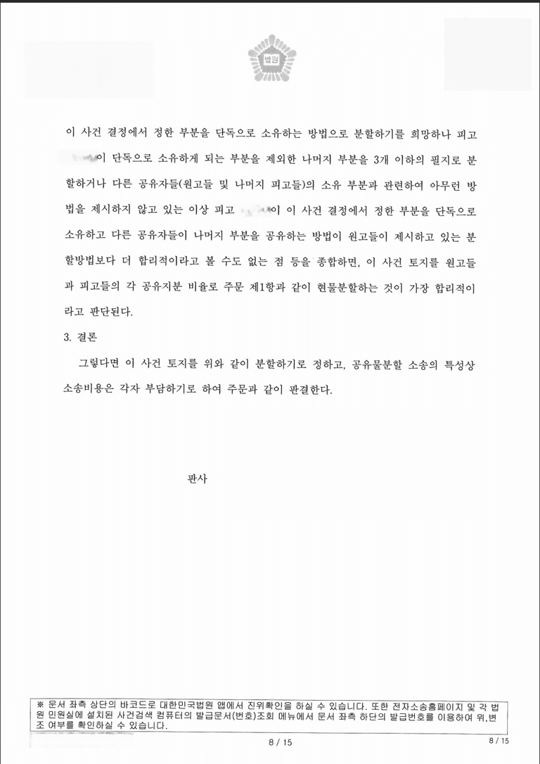 저는 즉각 공유물분할청구소송을 제기하였고 법원은 원피고들 각자의 공유지분에 따라 토지를 현물분할하는 내용의 판결을 내렸습니다.