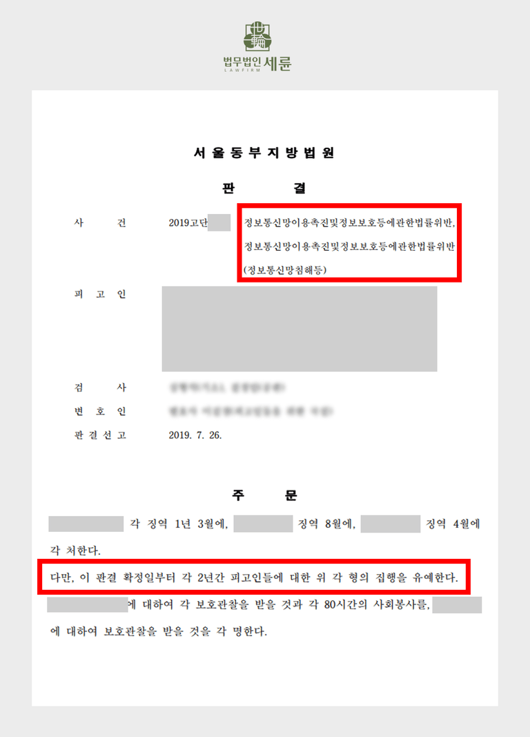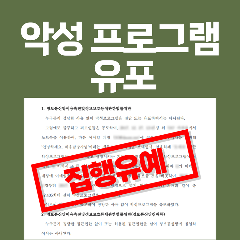 이 사건 역시 법원은 악성프로그램을 유포한 행위, 정당한 권한없이 타인의 정보통신망에 침입한 행위를 한 피고인 A에게 '정보통신망이용촉진및정보보호등에관한법률' 위반을 인정했습니다. 다만 이들이 유포 단계에서 검거가 되어 실질적으로 이득을 취한 것은 얼마 되지 않았을뿐더러 피고인들의 나이가 어리고 초범이었다는 점 등을 고려해 집행유예를 선고하였습니다.