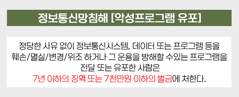 악성프로그램은 악의적 목적으로 컴퓨터 등에 정보를 훼손,변경,방해할 수 있는 프로그램을 의미하고, 이러한 프로그램을 유포하게 되면 정보통신망법 제48조 2항에 위반되어 7년 이하의 징역, 7,000만원 이하의 벌금에 처하게 됩니다. 상당히 높은 형량으로 처벌되고 있다는 것을 알 수 있죠.