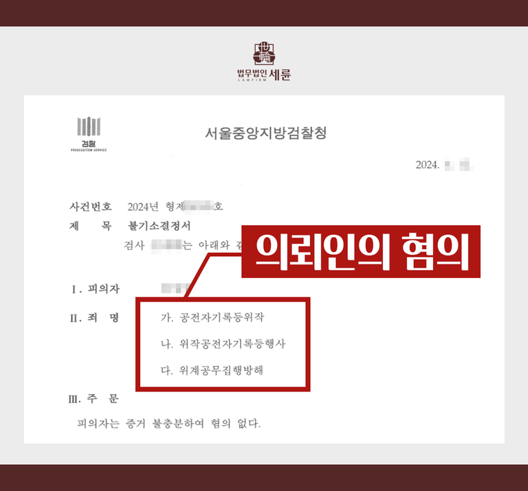 공전자기록등위작죄, 위작공전자기록등행사죄 혐의로 경찰, 검찰 조사 또는 형사 재판을 앞두고 계시다면 저희 세륜의 전문적인 조력을 받아보시기 바랍니다.