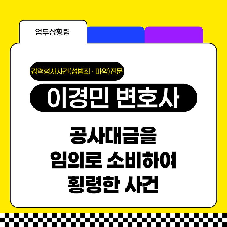 의뢰인은 공사대금을 관리하는 업무를 담당하며 공사대금을 회사 명의의 통장으로 받은 후 임의로 소비하여 횡령한 사실로 수사기관의 조사를 받게 되었습니다.