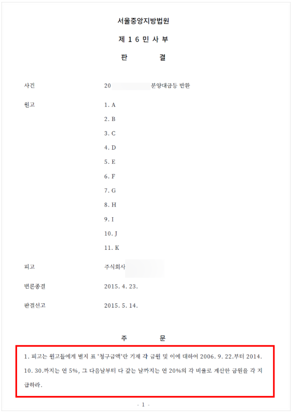 해당 소송에서 서울중앙지방법원은 "쇼핑몰과 같은 상가를 분양받거나 임차할 때 상가의 입지조건은 계약체결 여부를 결정짓는 가장 중요한 요소 중 하나"라며 이 사건 쇼핑몰에 대한 역세권 관련 내용은 사실과 다르게 광고한 것이므로 거래상 신의성실의 의무에 비춰 기망행위에 해당한다고 판단하여, 분양계약을 취소하고 피고로 하여금 원고들의 분양대금을 반환하라는 원고 승소판결을 아래와 같이 선고하였습니다.