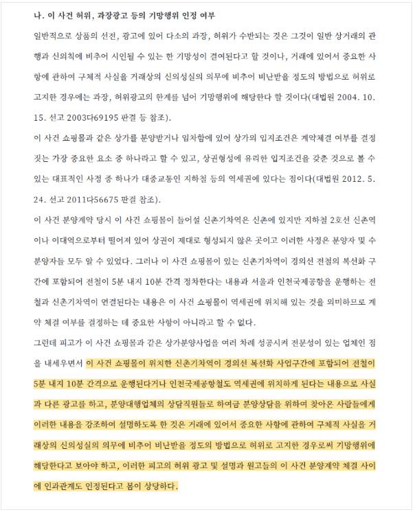 이러한 예시로, 서울에서 한 쇼핑몰에 대한 분양계약을 체결한 수분양자들은 이 사건 건물의 사업자가 역세권 입지와 관련하여 허위광고를 하였다며 분양대금 등 반환 청구소송을 제기한 바 있습니다.