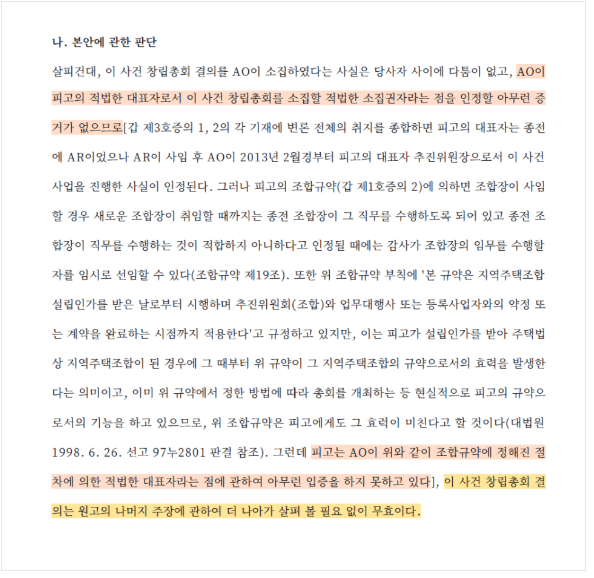 이에 대한 법원의 판단을 살펴보면, 먼저 법원은 총회에서 결의된 사항들이 모두 조합원들인 원고들의 법률상의 지위에 관한 결의이므로 원고들이 이 사건 창립총회 결의의 무효 확인을 구할 이익이 있다고 판단하였습니다. 그런데 이 사건 조합규약을 살펴보면 조합장이 사임할 경우 새로운 조합장이 취임할 때까지는 종전 조합장이 그 직무를 수행하거나, 감사가 조합장의 임무를 수행할 자를 임시로 선임할 수 있다고 명시되어 있는데, 이 사건 총회를 소집한 AO라는 신임 대표자가 조합규약에 정해진 절차에 의해 선임된 적법한 대표자라는 점에 관하여 아무런 증거가 없다고 판단하였습니다.