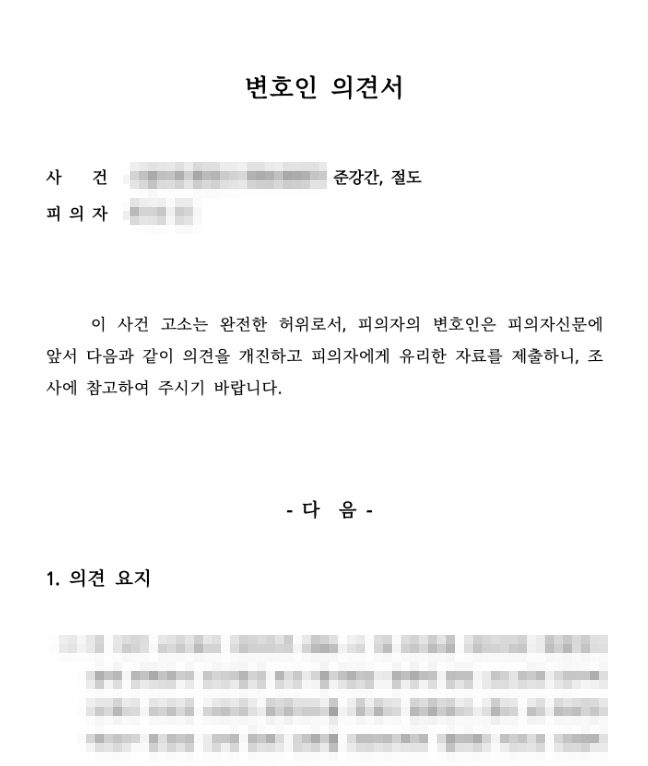 ○ 그동안 모은 증거와 판례를 바탕으로 경찰 단계 피의자 의견서를 제출하였습니다. 그리고 추가로 심리생리검사, 즉 ‘거짓말탐지기’ 검사도 대검찰청 출신 조사관으로부터 받아 진실 반응 결과를 피의자에게 유리한 자료로 제출하였습니다.