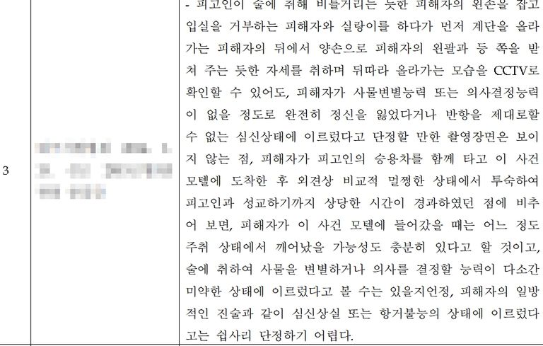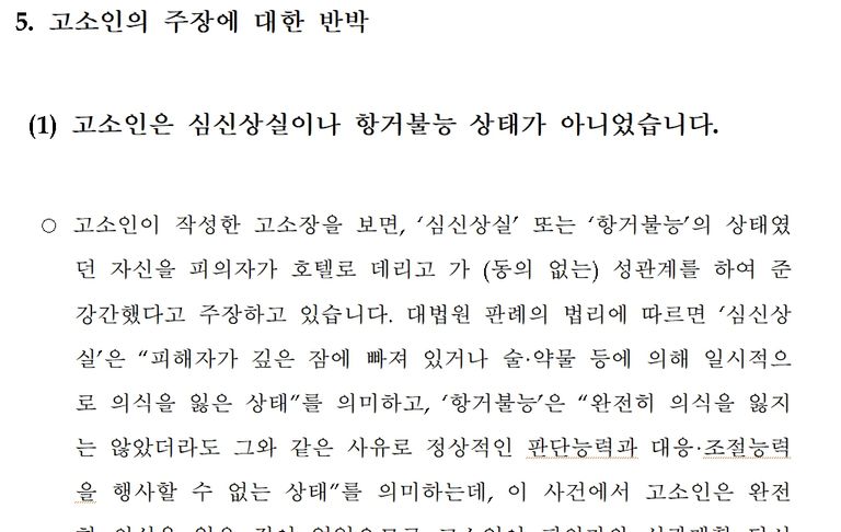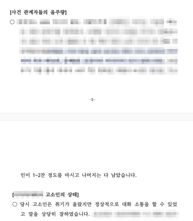 ○ 1차 경찰 피의자신문 이후, 담당 수사관의 질문 내용이나 제시 증거를 통해 고소인의 상세한 진술 방향을 추측할 수 있었습니다. 고소인은 경찰에서 유일하게 확보한 짤막한 방범 CCTV 영상 속에서 비틀거리는 장면을 포착해 그것을 항거불능의 증거로 내세우고 있는 상황이었고, 사건 이후 피의자와 주고받은 대화에서 초반에 우호적으로 대화한 부분은 제외하고 후반부에서 자신이 일방적으로 추궁한 부분만을 강조하면서 합의되지 않은 성관계라고 주장하고 있었습니다.