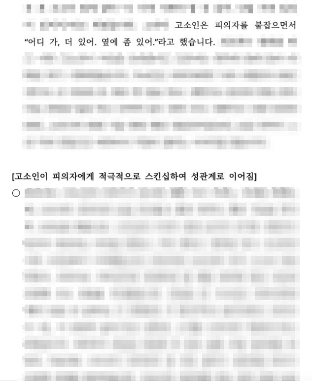 ○ 큰일이 닥치면 사람은 어떻게 대응해야 할지 아무것도 생각하지 못하고 백지 상태에 처하게 됩니다. 이 사건의 의뢰인 분도 마찬가지셨습니다. 그래서 우선 ‘사건 대응자료’를 만들어 드리고, 자세한 사건 경위를 청취하고 사건에 관련된 본인에게 유리한 자료들을 신속하게 확보하시도록 하였습니다. 성범죄 사건에서는 성관계 당시를 직접적으로 담은 녹음이나 영상은 없는 것이 보통이고, 직접적인 목격자 또한 없어 간접 증거가 항상 중요합니다. 특히 목격자들의 진술이나 현장CCTV, 현장에 주차되었던 차량의 블랙박스 영상 같은 것들은 시간이 지나면 소멸될 수 있기에 재빠르게 움직일 필요가 있습니다.