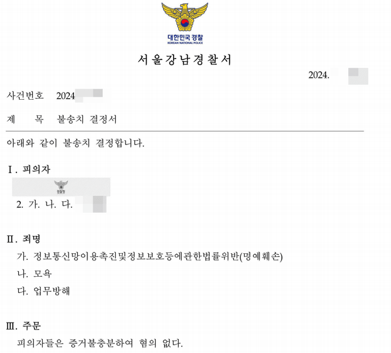 명예훼손 및 모욕죄 리뷰 고소 불송치 사례