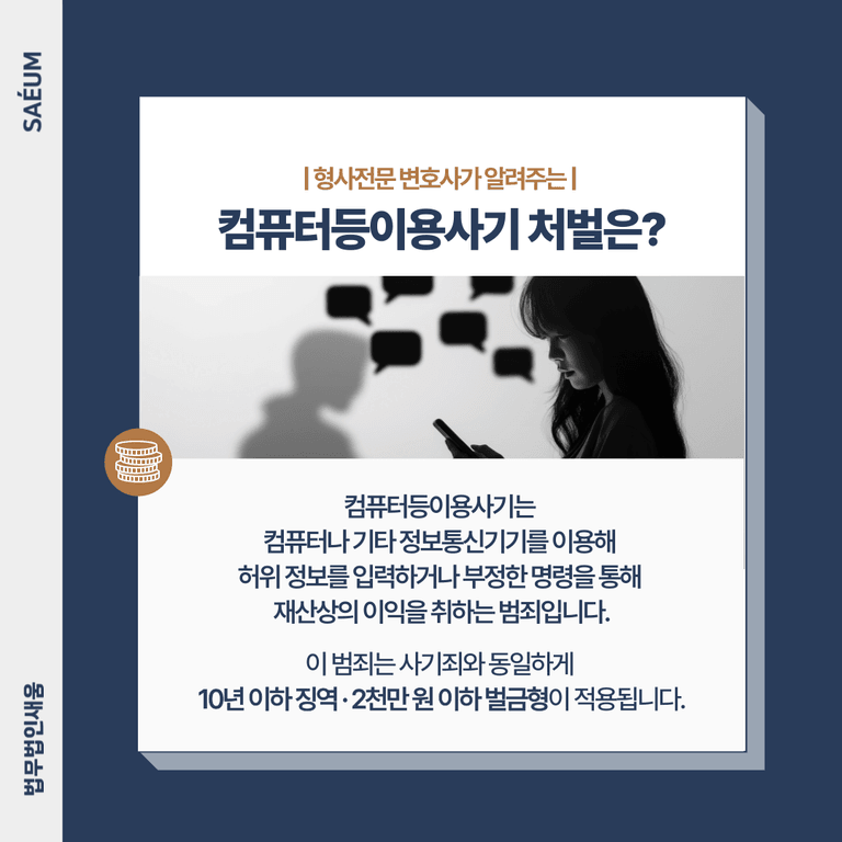 컴퓨터등이용사기는 컴퓨터나 기타 정보통신기기를 이용해 허위 정보를 입력하거나 부정한 명령을 통해 재산상의 이익을 취하는 범죄입니다. 전산기록을 조작하거나 현금처럼 사용할 수 있는 포인트를 조작하는 등의 방식으로 이루어집니다. 이 범죄는 사기죄와 동일하게 10년 이하 징역형 또는 2천만 원 이하 벌금형이 적용될 수 있습니다.