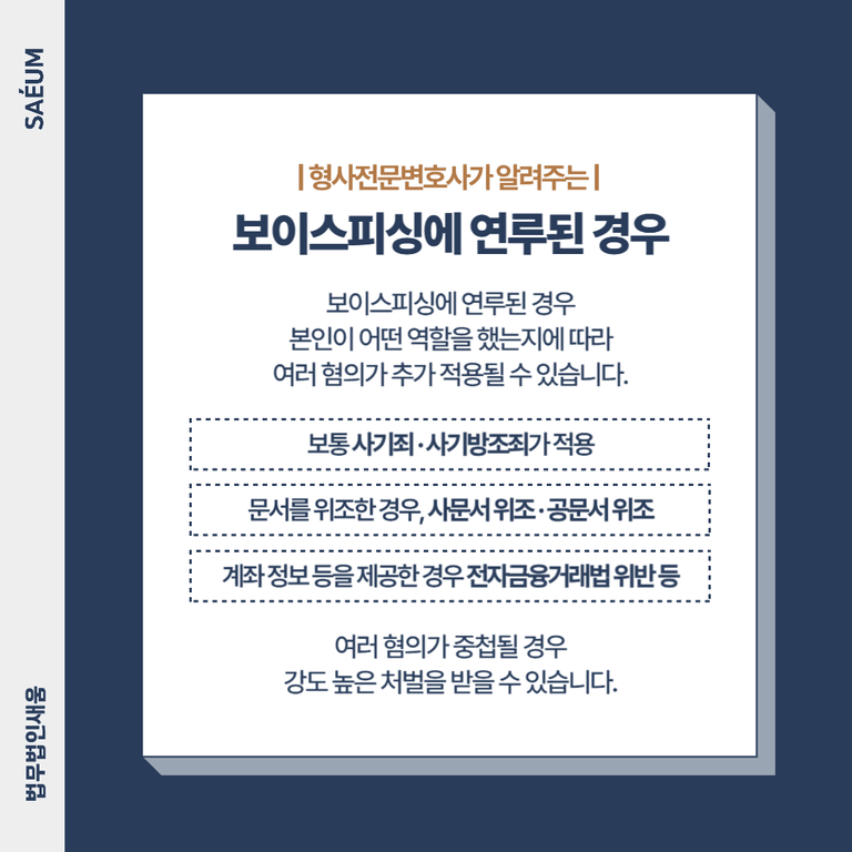 보이스피싱에 연루된 경우에는, 본인이 어떤 역할을 했는지에 따라 여러 혐의가 적용됩니다. 보통 사기죄, 사기방조죄가 적용되며, 경우에 따라 사문서 위조, 공문서 위조, 전자금융거래법 위반 등이 추가로 적용될 수 있습니다.